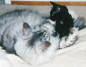 Janipurr's Boo Radley and Lunarcoons Jeoffry Radley went to his new home and made a new best friend-- a full-grown Maine Coon! |
